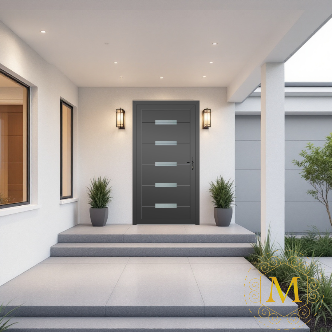 This premium aluminum entrance door features a FUHR multi-point lock system, offering enhanced security with multiple locking points. The door is equipped with triple glazing glass for superior insulation and noise reduction, while the 1.9″ thick polyurethane foam provides an excellent R-Value of 5.9, ensuring energy efficiency.
