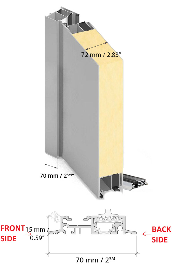 The door leaf has 2.7″ of polyurethane foam, further enhancing its insulating properties. The set includes an aluminum door and frame, along with the high-quality GreenteQ door handle made from stainless steel. You can also choose from wing or roller hinges, with concealed hinges as an option, all available in the same color as the door.